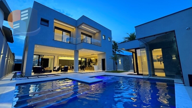 - 05 suítes, sendo uma máster com banheira de hidromassagem, box, varandas com portas em alumínio e persianas automatizadas, armários planejados, camas, painel e tv;